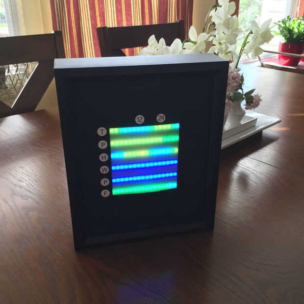 Montado en su propio recinto, el proyecto puede establecer en un estante, escritorio o colgar en una pared como una pantalla visual compactada para condiciones climáticas próximas en las próximas horas 32.