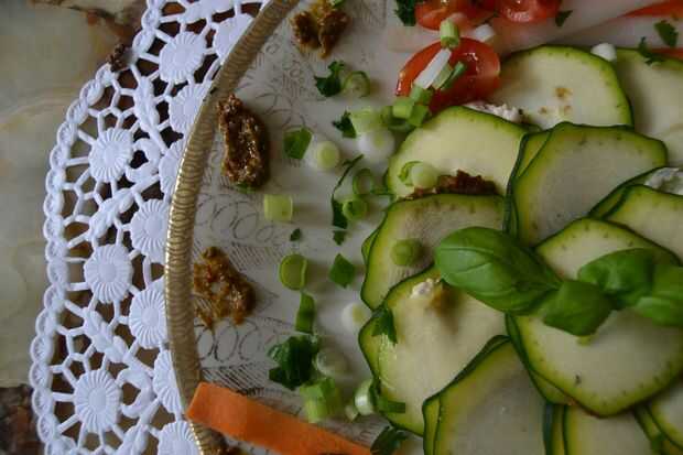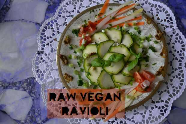 basado en el plato de pasta italiana tradicional, estos crudos-ioli están hechos de láminas crujientes de calabacín relleno con un delicioso cremoso anacardos "queso crema" y relleno de seta o con un pesto de nueces, albahaca y tomates secos.