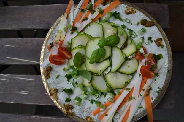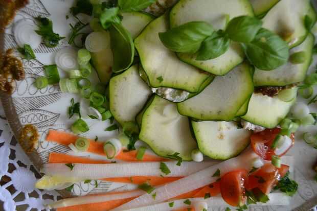 Ahora tome una rodaja de calabacín y poner una cucharadita de pesto encima, colmo de con una segunda rebanada de calabacita, el primer raw ioli está listo. llenar otro con crema de queso. Coloque las placas de omn crudo ioli, un pesto uno, luego un queso crema uno. Cuando se han preparado todos lo raw-ioli decorar los platos con el vegerables de guarnición y disfruta!