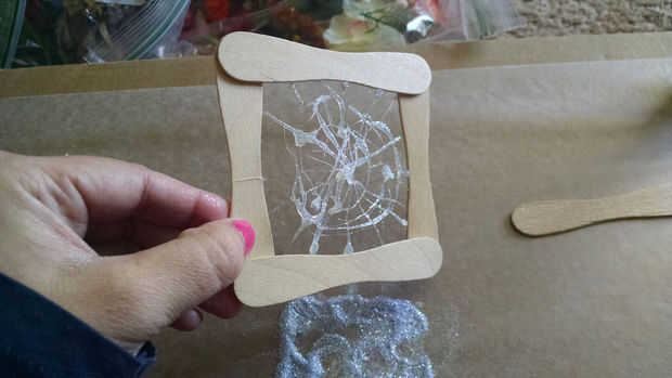 El pegamento debe haber colocado en el brillo y la web y el marco deben ser levantados fácilmente. Si hay globos grandes de pegamento que se adhiera a la superficie, puede que necesite utilizar algo como una espátula para despegarlo.