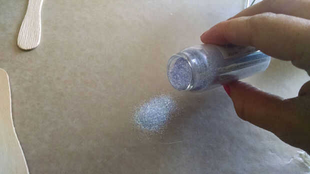 En una superficie lisa o superficie cubierta con papel encerado, coloque el marco abajo y vierta algún brillo en el centro. Forma para llenar el interior de la Plaza.
