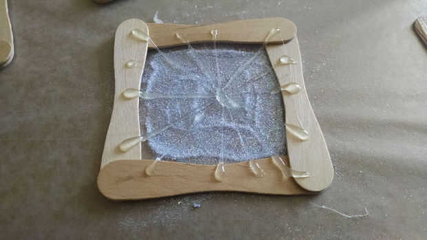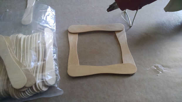 El marco para la web se hace con palitos o cucharas de madera. Simplemente pegarlas juntas para hacer un cuadrado.