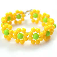 Aquí es una buena idea del patrón de la pulsera de flores. Es muy conveniente para usar en primavera. No habilidades rebordeando complicado, todo el mundo puede hacer esta pulsera de flor amarilla. Todo lo que necesitas es preparar estos materiales como Abalorios acrílicos amarillo 6mm, 8mm verde granos de acrílico, cola y alternar broche de tigre. Es muy conveniente para las niñas. Si te gusta este modelo de pulsera de la flor, sólo tienes que seguir para aprender cómo hacer una pulsera de cuentas flor ahora.