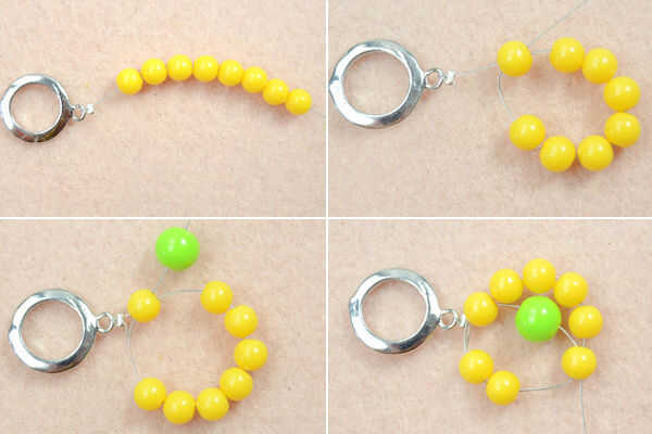 1 º preparar un 60cm tigre cola, fije el cable con el cierre de palanca con un grano de la encrespadura, enhebrar 8 perlas amarillas para alambre, hilo de rosca del alambre hacia el primer grano para hacer un lazo, coloque una capa verde para alambre, hilo de rosca del alambre para el grano amarillo 6 y apriete los cables;
