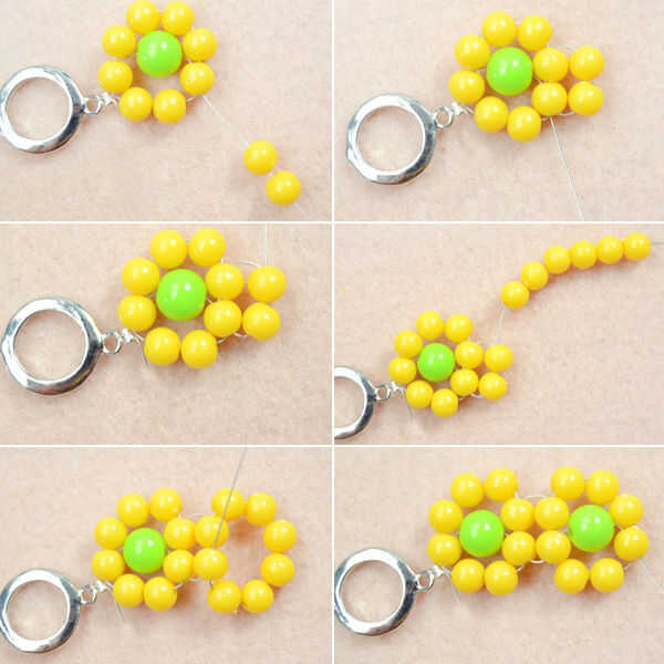 2 º, añadir 2 granos amarillo, hilo de rosca el cable a través el grano amarillo 5 y 6 en el primer lazo de perlas, luego hilo el cable con el recién 2 granos amarillo, añadir 6 granos amarillo, hilo de rosca del alambre para el grano amarillo 1 º para hacer el segundo bucle de granos, enrosque el cable con el grano amarillo 6 en el segundo bucle de granos; se hace el patrón de pulsera flor básica;