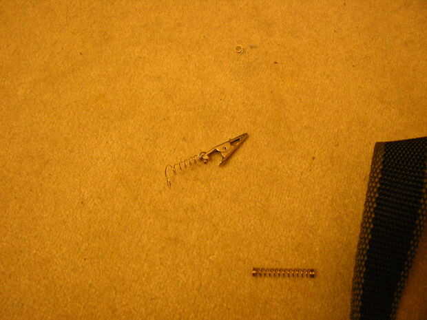 Roto un cable cocodrilo para obtener el cocodrilo consejos, recogió dos pequeños manantiales de mecanismos de plumas, hace un lazo con una pinza y colocado en los agujeros de la sugru.