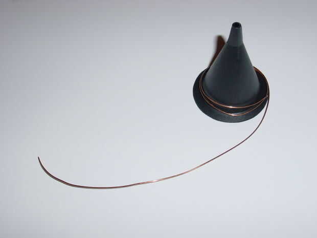Corte una 22" longitud (aprox.) de alambre de cobre.   Seleccione un objeto cilíndrico que tiene una circunferencia similar a su tamaño de huevo.   He usado un embudo de cocina pequeño.   Doblar un extremo del alambre alrededor del embudo dos veces alrededor.