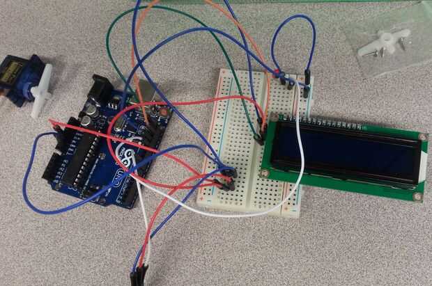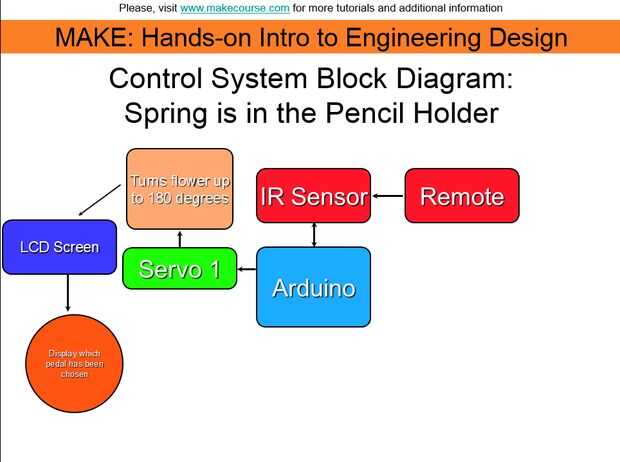 En el diagrama de bloques del sistema de control de este proyecto, el infrarrojo remoto (IR) envía una señal al Sensor de IR una vez que se presiona un botón. El Sensor IR señales de Arduino Uno y le dice qué hacer en base a qué botón se presionó. El Arduino Uno transmite el cierto código para el servo, que ejecuta la acción y rota la flor entera a un grado especificado. La pantalla LCD muestra que pedales ha sido elegido. Todo esto aparece en el circuito de la actualidad de la siguiente foto. En el protoboard, hay un apartado que es solamente para los cables de positivo y tierra respectivamente.