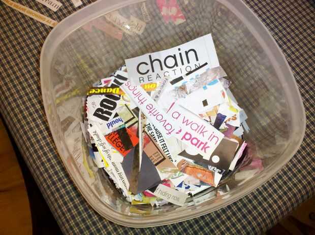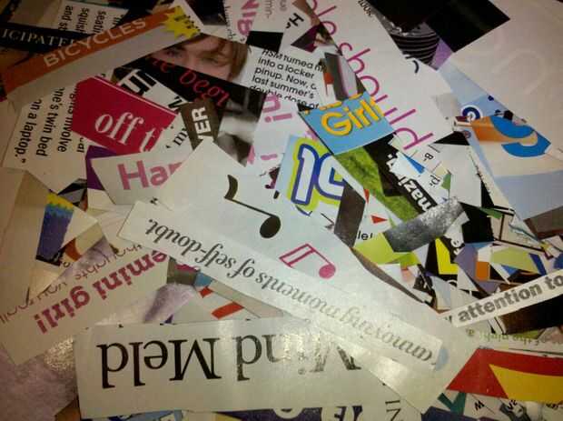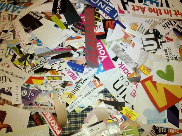 ¡ RECUERDE! Necesita recortar palabras de todos los tamaños, fuentes y colores. Pero el tamaño es importante. Usted estará poniendo éstos juntos en orden aleatorio y habrá lagunas en su collage que usted tendrá que completar con otras palabras. A veces habrá itty bitty vacíos. A veces serán pequeñas pero evidentes. Tan incluso si crees que es demasiado pequeño una palabras usted debe todavía recórtalo. Nunca se sabe lo que va a venir bien!