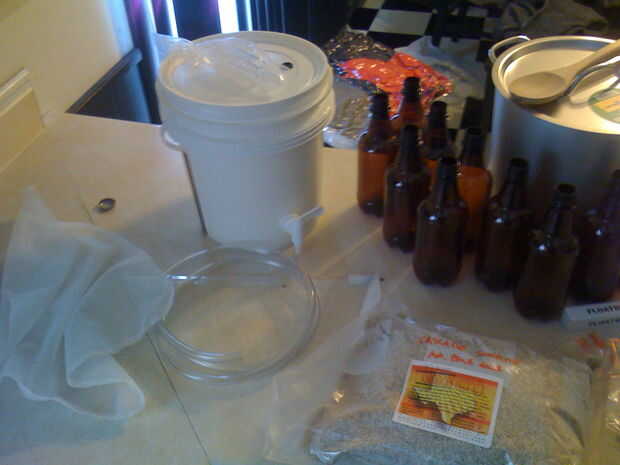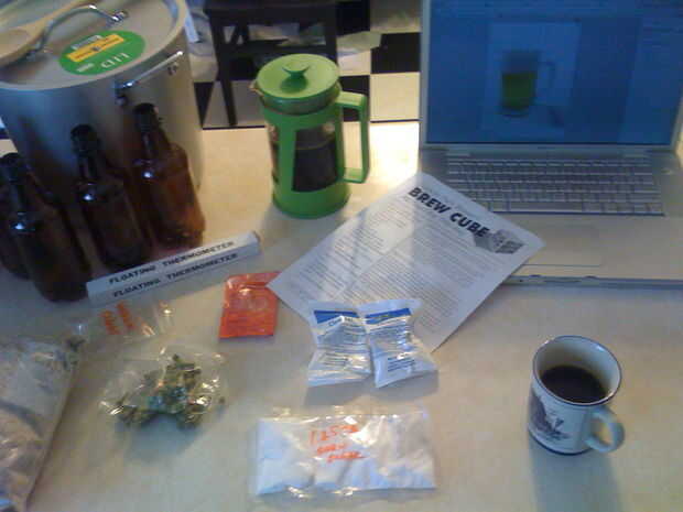 Malla de red para el grano, el cubo y la bolsa de aire, tubos de diferentes longitudes, grano, botellas, bote de cerveza y cuchara, flotantes termómetro whirlfloc, lúpulo, levadura, limpiador, azúcar de maíz, instrucciones, café, buena viejo jugo de manzana (confiable pero envejecidos, Macbook) para cuando me meto en aprietos.