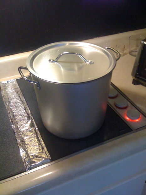 Después de la limpieza de cada componente, algunos ni se usa en el primer día comenzó el proceso hirviendo 4 cuartos de galón de agua potable a una temperatura de 164 grados. (10 grados más altos que mi temperatura de puré. La idea es traer la mezcla 10 grados más calientes que la temperatura final, por lo que la temperatura final será punto final de la empinada). Es importante beber o agua y no agua de primavera. También deben abstenerse de usar agua del grifo.