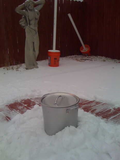 En este punto, es importante llevar la mezcla a una temperatura de 65-70 grados. Esto permite la transferencia correcta en el cubo de fermentación. Agradecimiento a mi amigo, me recordó que había nieve en el suelo. Pude saltar el baño de hielo en el lavabo y coloque la jarra de cerveza en un montículo de nieve recién paleaba. Comprobé a la temperatura para las próximas horas y paleado nieve nueva alrededor de la olla de café según sea necesario.