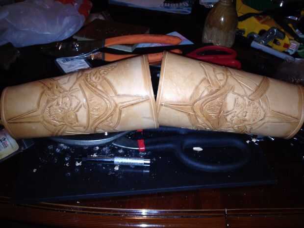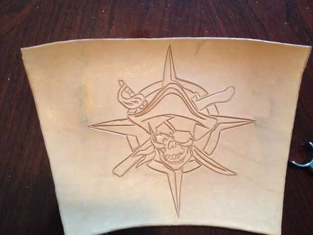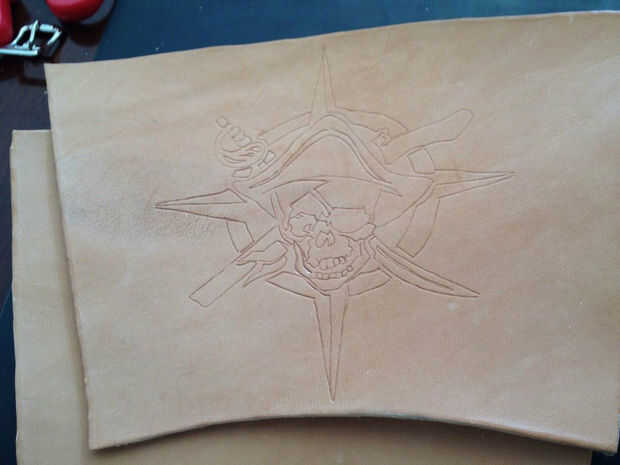 Foto 2. Utilicé una hoja giratoria para definir el contorno. Tenga cuidado de no llevar su insignia o detalle demasiado cerca al borde de la piel. Mientras que haciendo estos brazales que me di cuenta de que el norte y el sur puntos en el compás se levantó realmente debilitar los bordes de los brazales.