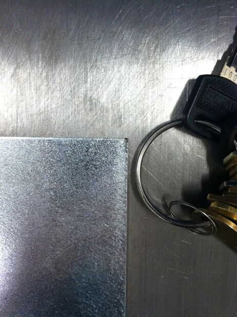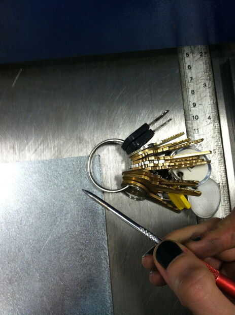 Coloque el llavero al lado de su chatarra. Haga una marca en el metal de modo que sepa dónde alinear el corte; Mina corté aproximadamente. 5", ya que va a funcionar muy bien con el diámetro de mi llavero.