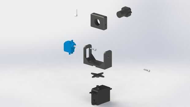 Tomar el pequeño servo estándar y colóquelo en la abertura cuadrada en el soporte de la bandeja de cámara. Tornillo con al menos uno de los orificios de montaje. El eje del servo debe ubicarse de modo tal que está más alejado de la parte inferior del soporte (consulte la vista despiezada).