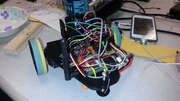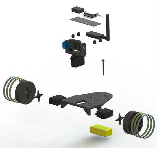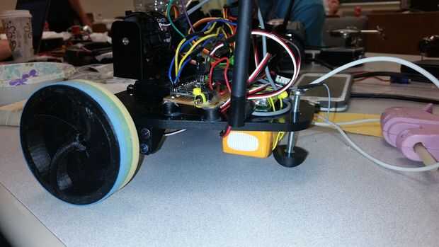 Comenzar tomando el armazón (terminado antes) e instalar la rueda sub asambleas sobre él. Esto sólo es necesario ligera presión para sujetar los cuernos servo (ahora integrados en las ruedas) sobre los ejes del servo.