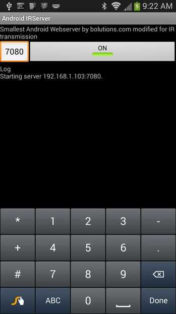 Para hacer que mi aplicación web-control basado en infrarrojos, empecé con el código para el servidor de web Android de código abierto más simple pudo encontrar y lo modificó para reproducir señales infrarrojas codificadas de audio cuando la solicitud de un cliente incluye un ? ir = xyz consulta donde xyz es una descripción de la señal infrarroja (que explicaré en un paso posterior). Código fuente completo está aquí.