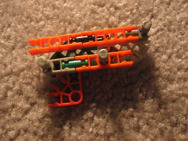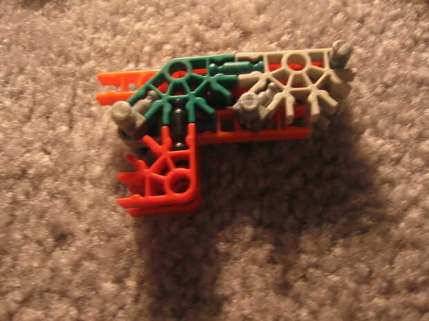 este arma k'nex es mi primera pistola, munición (conectores naranja) se lleva en la parte inferior de la empuñadura y tiene un verdadero disparador. Esta pistola fue hecha sobre... medio año (creo) antes de postear, estoy un poco pasado esto ahora. H