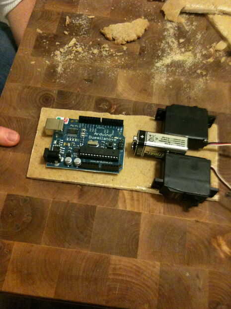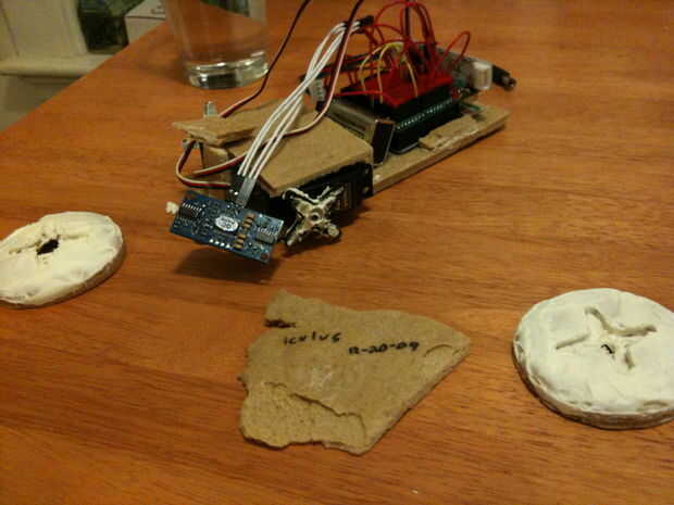 A medio camino a través de ensayos, algunas partes se rompió, pero fueron sujetadas con cinta y han no sido reparadas a partir de la publicación de este instructable (pero serán pronto, estad atentos). Fotos finales sin grabados no fueron capturados debido a la inmensa emoción de robot.