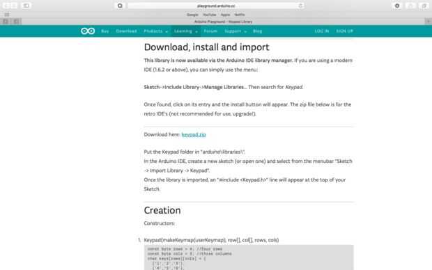 Otra cosa para descargar para que este proyecto a trabajar es la biblioteca. Las bibliotecas facilitan cada modelo a construir. Significa que hay menos codificación para hacer. Funciona como una base para hacer todos los proyectos. Así que la biblioteca que necesita es la biblioteca de teclado. Una vez descargado necesitas poner el archivo en la carpeta de bibliotecas de arduino. Puede descargar la biblioteca de http://playground.arduino.cc/Code/Keypad está a medio camino abajo.