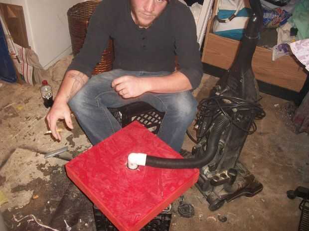 En la parte superior debe tener un área de 12 x 12. Hemos perforado agujeros sobre una 1/2" en varias filas en la parte superior entera. Hemos añadido las patas en la parte inferior, se pueden hacer con cualquier cosa, solo necesita espacio en la parte inferior de la aspiradora de la manguera. Y eso es todo!