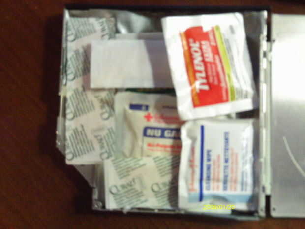 Este es un kit de primeros auxilios muy bonito que hice;algunos elementos adicionales que podrían añadirse son: una toallita de alivio de la picadura, cierta cantidad de cinta adhesiva, un alfiler para reventar ampollas, un pequeño trozo de piel de t