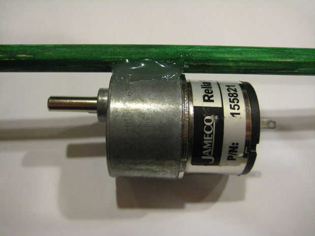 A continuación, agregue una arandela en la parte superior del árbol para servir de apoyo lateral para el cable. Sólo mantener la lavadora en su lugar directamente sobre el eje del motor y utiliza pegamento caliente para sostener a la varilla de pasador.