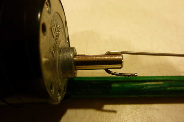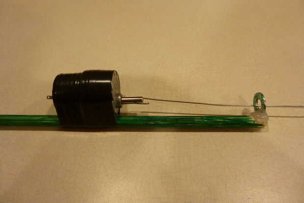 A continuación se que debe agregar el motor a la varilla. Antes de hacerlo necesita perforar un pequeño agujero a través del eje si ya no tienes uno. El agujero tendrá el extremo del cable que soporta la imagen a través de él.