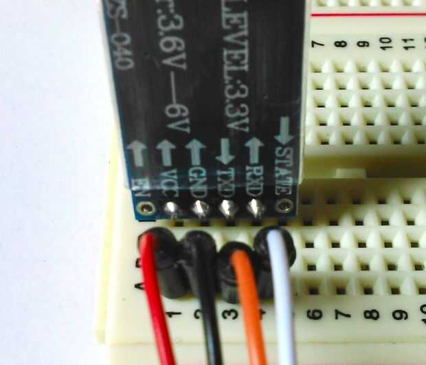 Nota: No tenemos que dividir voltaje la señal en el cable naranja puesto que esto sólo se utiliza para los datos que salen de la tarjeta de bluetooth (que de todos modos es 3,3 v)