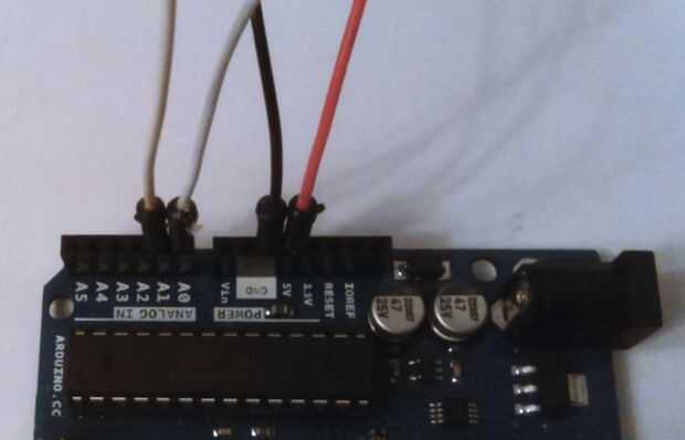 Ahora hay que conectar las salidas de los potenciómetros (pernos de mediados) a los pines de entrada de Arduino. Los cables usando blanco (así como para que no se confunda con los negros y rojos que hemos utilizado ya) conectan la clavija media de un potenciómetro en pin A1 en el Arduino, luego el perno medio otro potenciómetro para Arduino pin A0. Ver las fotos de arriba para ver cómo esto se debe ver.