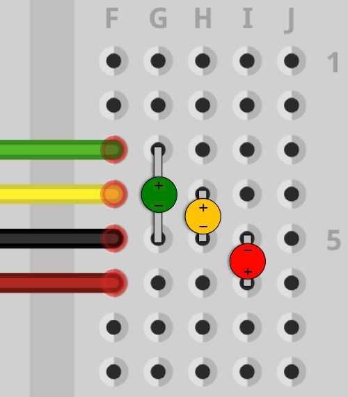 Conecte el las patas negativas (cortas) sobre los LED a uno de los pines de tierra (GND) en el arduino.