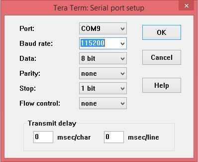 Entrar en el puerto correcto, velocidad en baudios de 115200, 8 bits de datos, sin bit de paridad, 1 bit de parada y sin control de flujo. Golpear OK.