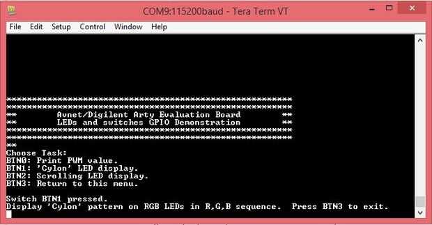 Si pulsas 1 BTN, la demo pasará al modo de cylon. Este modo utiliza los LEDS RGB y ciclos a través de diferentes colores. Puede ver más detalles de la secuencia de la salida serial.