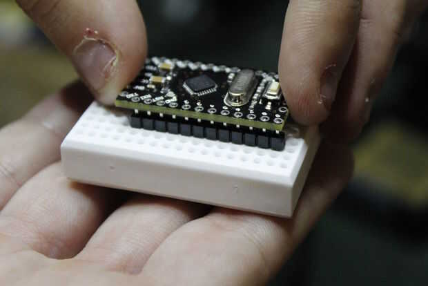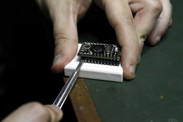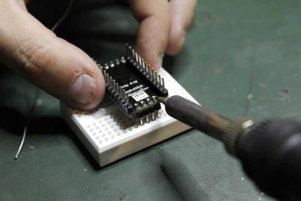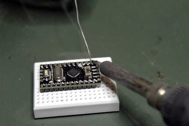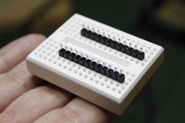 - Cabezales de soldadura puede ser bastante fácil si usted toma ventaja de un protoboard. Pon en él y luego Arduino sobre conectores.
