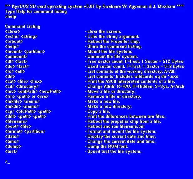 KyeDOS fue creado por Kwabena Agyeman y James Moxham. Muestra el un poco de la potencia del microcontrolador Parallax que la Mini computadora de bolsillo. Incluso estilo años 80, Atari font es sustituido por uno que podría esperar en un sistema DOS.
