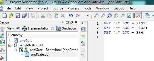 Paso 11 - entonces tenemos que asignar los pines de Puerto Real a símbolos de programa. Esto puede hacerse creando archivo ucf como se muestra en el paso 11,12 y 13. Archivo ucf, escribe programa a mapa a, b, c y P131, P132 P44 respectivamente.