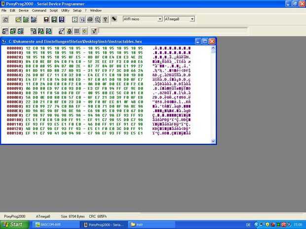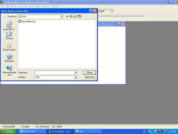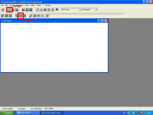en PonyProg, haga clic en abrir y seleccione el archivo .hex que acaba de crear mediante la compilación el archivo .bas en Bascom AVR.