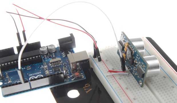 2. Coloque el sensor de ultrasonido Ping en el protoboard. Conecte la izquierda pin más a la tierra, el centro para la fuente de alimentación (+ 5V) y el eje derecho de la mayoría al pin digital 6 en el Arduino.