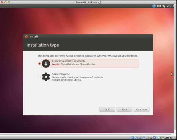 2. al llegar a la pantalla en la tercera imagen Seleccione "Borrar disco e instalar Ubuntu". No tengas miedo que esto no borrará su disco duro. Ubuntu sólo ve el disco duro virtual que creó y no interactuará con disco duro "real" - por lo que si hacen algo totalmente loco simplemente eliminar y recrear la VM, no hay daño no hay falta.