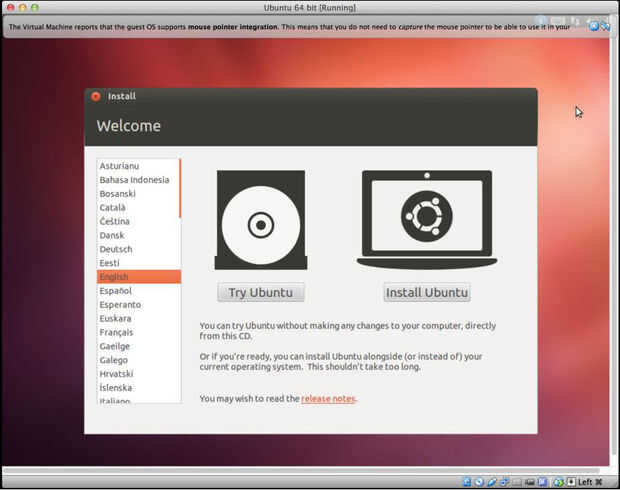 Ahora usted debería ver la ventana de instalación estándar de Ubuntu. Seleccione su idioma y haga clic en "Instalar Ubuntu". En este punto basta seguir al asistente de instalación muy bien hecho y deja la instalación hacer su cosa. Hay solamente dos puntos problemáticos potenciales que pueden dispararse...