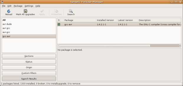 búsqueda de gcc-avr y luego avrdude y marcarlos para su instalación, luego instale! simple.