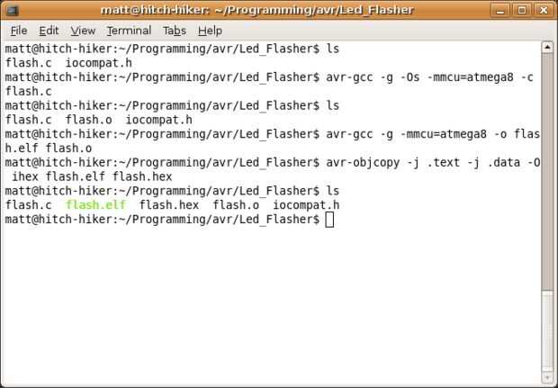 Ahora, esto ha producido un archivo binario llamado flash.elf, que es un archivo ejecutable de GNU. que se metan con él un poco más y tomar algunos bits para hacer el archivo hexadecimal