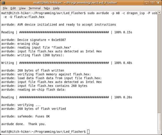 sudo avrdude -p m8 - c dragon_isp -P usb -e - U flash:w:flash.hex