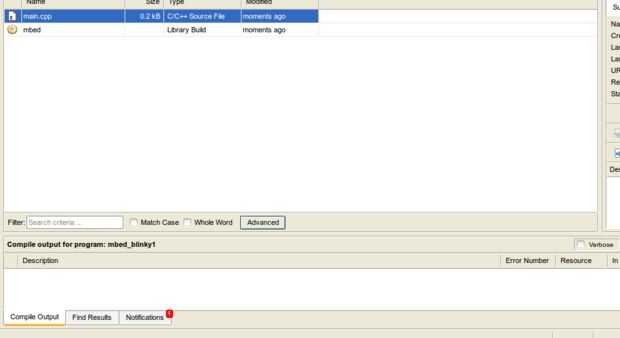 #include "mbed.h"<br> DigitalOut RED(LED_RED); DigitalOut GREEN(LED_GREEN); DigitalOut BLUE(LED_BLUE); int main() { while(1) { RED = 1; GREEN = 0; BLUE = 0; wait(0.2); RED = 0; GREEN = 1; BLUE = 0; wait(0.2); RED = 0; GREEN = 0; BLUE = 1; wait(0.2); } } Haga clic en "compilar" después de algún tiempo que usted debería ver "Descargar archivo" ventana pop-up o si usas Chrome la descarga del archivo ejecutable del programa compilado debe descargarse.