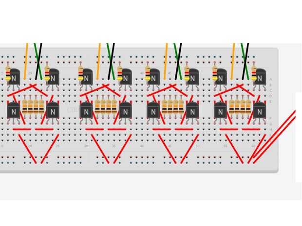 Lamentablemente en circuits.io no es circuitos integrados, que se puede utilizar en la simulación de la protoboard. Por esta razón debemos implementar circuitos integrados simples, usando transistores. Implementar un latch RS 4 y algo así como 4 y puertas.