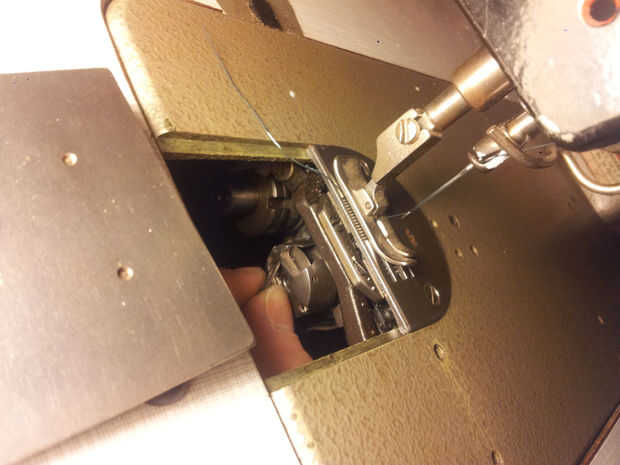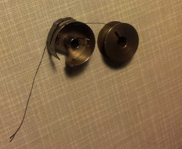 Cortar el inicio de la rosca y dejar al final como 5cm de largo. Si es necesario, limpie el mecanismo del hilo bajo levantando la puntera o girando el volante de la máquina. Vuelva a montar la bobina.