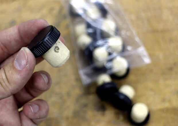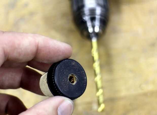 Usando un 1/4" broca perforé un orificio en el centro de la tapa de plástico sobre a medio camino a través del corcho.
