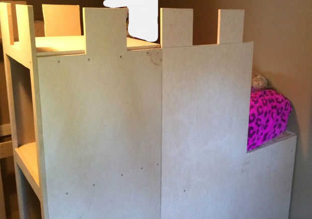 La entrada al castillo y el costado sobre la cama son en su mayoría decorativa pero también sirven para sostener la pequeña tyke en la cama. Originalmente contaba con tener almenas claro a través de la frente o los laterales, pero decidí cambiar al estilo más de Castillo de Cenicienta o el castillo de My Little Pony con techos triangulares y tal. Ha habido algunas preocupaciones declaró que el punto podría plantear una amenaza potencial. Después de que la cama es pintada yo volver y hacer de la parte superior de esta parte para actuar como un tapón y a proteger los extremos del MDF.
