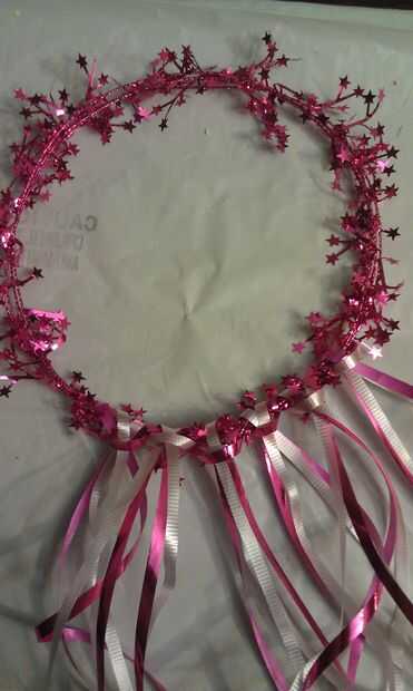 Usando la cabeza de su hijo como una forma de guía el círculo de la corona que envuelve el exceso de alambre alrededor de sí mismo y añadir las seis hebras de cinta a un lado de la corona