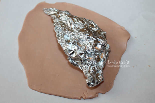 Coloque la parte delantera de la oreja de papel de aluminio sobre el rodado hacia fuera arcilla.